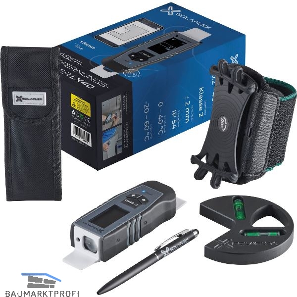 Lieferung inkl. Laser-Entfernungsmesser LX40, Gürteltasche, 360° Handy-Armhalterung, Zentrierhilfe ZX0, Touchpen, 1-Jahres-Lizenz für die Benutzung der Premiumfunktionen. Die Solaflex-App kann kostenlos im Google-Play-Store oder im App-Store heruntergeladen werden.