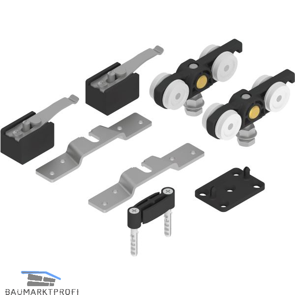 Lieferumfang:2 Rollapparate2 Tragflansche2 Fangstopper1 Bodenführung spielfrei1 Befestigungsplatte zu Bodenführung