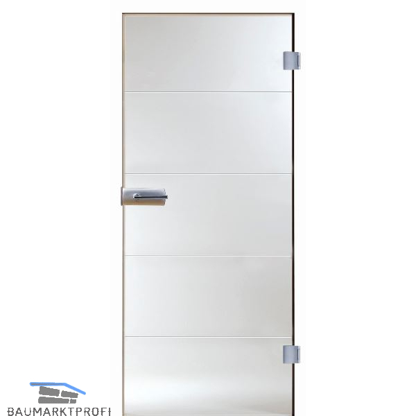 Das Ganzglastürblatt aus gehärtetem Einscheibensicherheitsglas (ESG) überzeugt durch seine Oberfläche mit präzise ausgeführten, geschliffenen Rundrillen. Diese Kombination gewährleistet eine optimale Balance zwischen Sichtschutz und Lichtdurchlässigkeit.