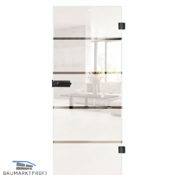 Das satinierte Ganzglastürblatt aus gehärtetem Einscheibensicherheitsglas (ESG) überzeugt durch seine Oberfläche mit präzise ausgeführten, klaren horizontalen Querstreifen. Diese Kombination gewährleistet eine optimale Balance zwischen Sichtschutz und Lichtdurchlässigkeit.