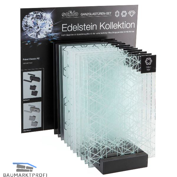 Je eine Mustertafeln der Edelstein Kollektion Gläser: Brillant, Diamant, Smaragd, Grande Smaragd in den Ausführungen klar und weiß,