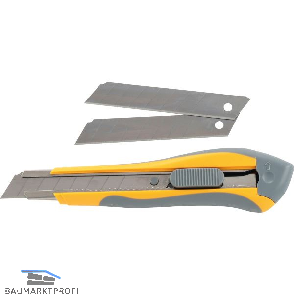 Mit Abbrechklinge, ergonomischer und schlanker Zweikomponentengriff,Stahlklingenführung, Automatik-Klingenarretierung, inklusive Ersatzabbrechklingen im Griff.