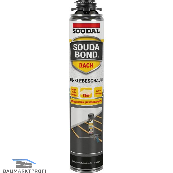 Soudabond Dach ist ein gebrauchsfertiger, einkomponentiger, selbstexpandierender, feuchtigkeitshärtender Polyurethanklebstoff für die rationelle, saubere, sparsame und dauerhaft sichere Verklebung von Wärmedämmstoffplatten im Flachdachbereich.