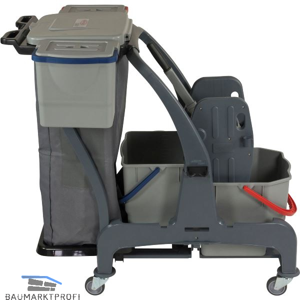 Lieferung inkl. 25 Liter Eimer rot, 18 Liter Eimer blau, 2 x 6 Liter Eimer rot + blau Halterung für Müllsack, Doppelbacken-Mopp-Presse und seitliche Moppablage