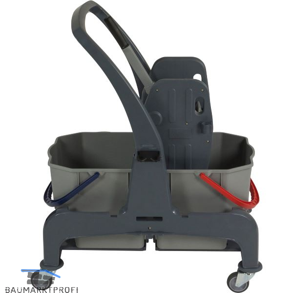 Lieferung inkl. 2 x 25 Liter Eimer rot + blau, Kunststofffahrwagen mit Schubbügel, Doppelbacken-Mopp-Presse und seitlicher Mopp-Ablage
