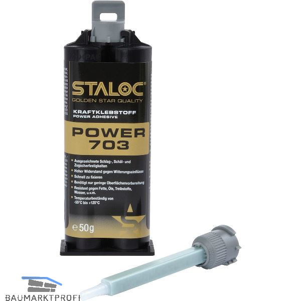 STALOC POWER 703 verfügt über eine ausgezeichnete Schlag-, Schäl- und Zugscherfestigkeit. Er ist schnell zu fixieren und benötigt nur eine geringe Oberflächenvorbereitung, jedoch muss immer ein Klebespalt von 0,5 bis 1 mm zur Verfügung stehen um eine optimale Verklebung zu erreichen.