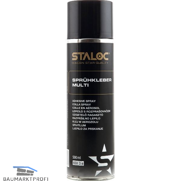 STALOC Sprühkleber MULTI klebt schnell und effektiv Papier, Gewebe, Schaumstoffe, Leder, Pappe, Himmelstoff, Bespannungen aus Kunstleder/Stoff, Vinyl, Dämm-Matten und Gummi untereinander sowie auf unlackiertem / lackiertem Metall und Holz. Ein filmbildender Klebstoff mit guter Anfangshaftung und hoher Klebekraft. Die Eigenschaften sind speziell auf die vielseitigen Einsatzmöglichkeiten in Industrie, Bau und Handwerk abgestimmt. Auch zur Verklebungen von Styropor© undXPS Hartschaumplatten geeignet. Nicht geeignet für PE und PP Kunststoffe.