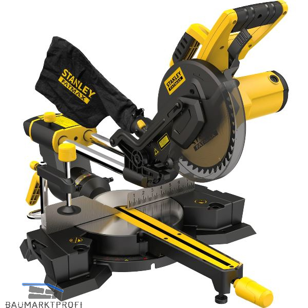 Hartmetall-Sägeblatt 216 x 30 mm (40 Zähne), 2 ausziehbare Materialauflagen, Materialzwinge, hoher Schiebeanschlag, Staubfangbeutel, horizontaler Zug-Griff, Schnellverstellung mit Fixrasten, Laser