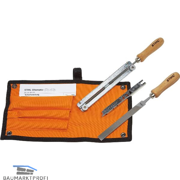 Mehrteiliges, bewährt robustes Schärfset in robuster Tasche mit Gürtelschlaufe. Feilenhalter mit Rundfeile. Flachfeile zum Nachbearbeiten der Tiefenbegrenzer. Feillehre zur Kontrolle von Brust- und Schärfwinkel, Zahnlänge sowie Tiefenbegrenzerabstand. Auch zum Reinigen von Nut und Öleintrittsbohrung der Führungsschiene. Ausführung für die Pflege von .325"-Ketten.