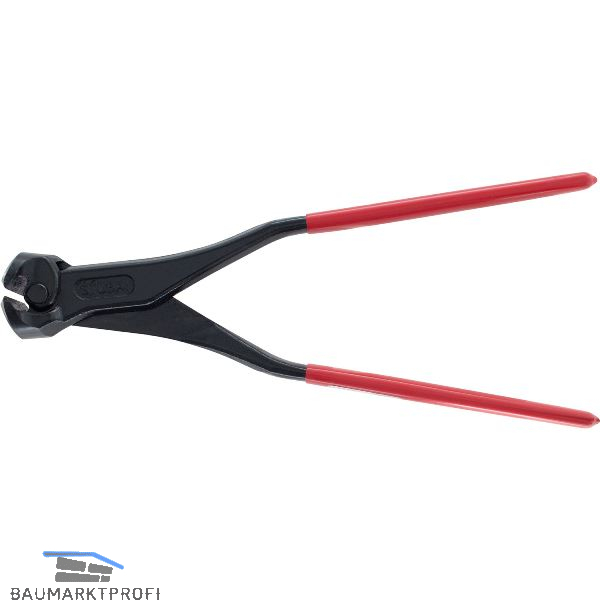 Eisenflechterzange mit breitem Kopf. Das extreme Übersetzungsgverhältnis: Die langen Zangen-Schenkel, der weit nach vorne gelegte Drehpunkt und die Leichtgängigkeit ermöglichen ermüdungsfreies Arbeiten auch bei längeren Einsätzen.