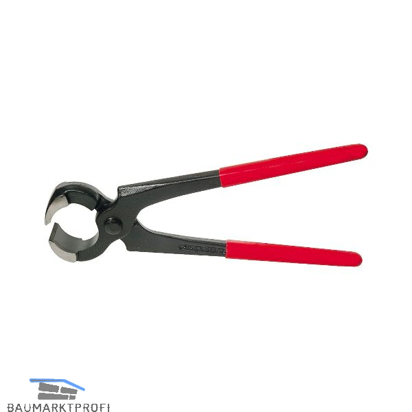 Spengler-Universalzange, geschmiedet, mit besonders großem poliertem Kopf. Aufgelegtes Gewerbe, Schenkel rot kunststoffbeschichtet, Schneiden induktiv gehärtet. Werkstoff C-45 Kohlenstoffstahl.