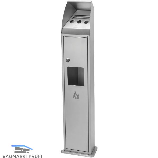 Abfall-Ascher Kombi aus Edelstahl. Zwei getrennte, einzeln herausnehmbare verzinkte Innenensätze, abschließbar. Zur Bodenbefestigung mit Bodenplatte. Die an der Vorderseite angebrachte Tür ist zur Seite zu öffnen. Ideal im Außenbereich, Eingangsbereiche, Hotels, Einkaufzentren, Parkanlagen, öffentlichen Einrichtungen.