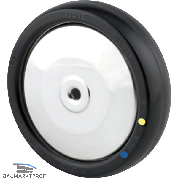 Radkörper aus Zinkdruckguss, Lauffläche aus schwarzem Vollgummi, kontaktverfärbungsfrei, elektrisch leitfähig, mit Fadenschutz, Präzisionskugellager, abgedichtet, temperaturbeständig - 20 bis + 85 °C