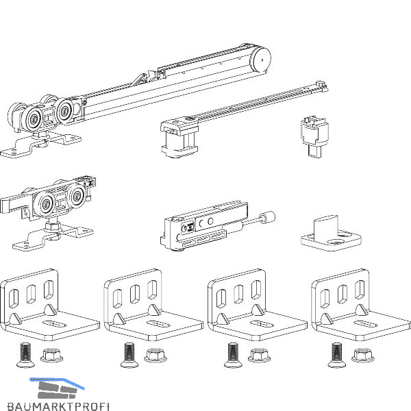 Ohne Laufschiene. Mit Einzugsdämpfung und gedämpften Fangstopper. Für Decken- oder Wandmontage.