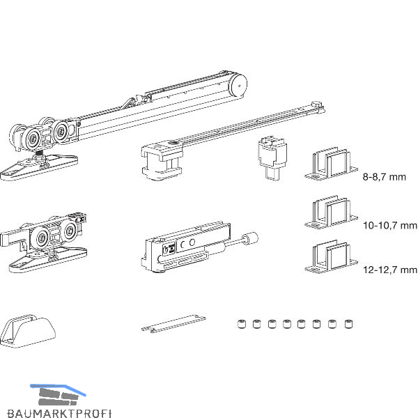 Ohne Laufschiene. Mit Einzugsdämpfung und gedämpften Fangstopper. Für Decken- oder Wandmontage.