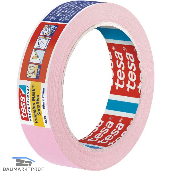 tesaPräzisionskrepp® Sensitive 4333 besteht aus einem reißfesten, extradünnen Spezialträger, beschichtet mit einer Acrylat-Klebmasse. Aufgrund des hochwertigen, sehr anschmiegsamen Trägermaterials werden präzise, randscharfe Farb- und Lackkanten erzielt. Außerdem läßt sichtesaPräzisionskrepp® Sensitive 4333 besonders leicht verarbeiten. Dank der speziellen, besonders untergrundschonenden Klebmasse lassen sich auch kritische und besonders empfindliche Untergründe, wie z.B. Decor-Tapeten und Altbeschichtungen bekleben, ohne dass diese beim Wiederablösen beschädigt werden.