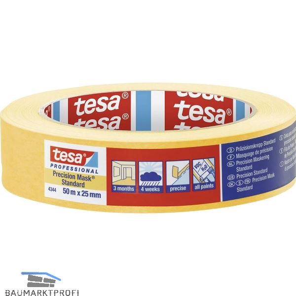tesa Präzisionskrepp® 4344 Standard eignet sich für viele Abklebearbeiten bei Maler-und Lackierarbeiten. Neben den gängigen Farb- u. Lacksystemen ist das Abdeckband auch für Lacke und Lasuren sowie für Silicat- und Kalkfarben einzusetzen. Durch die Verweildauer im Innen- und Außenbereich sind mehre Arbeitsprozesse mit nur einem Arbeitsgang beim Abdecken und Schützen zu erledigen.