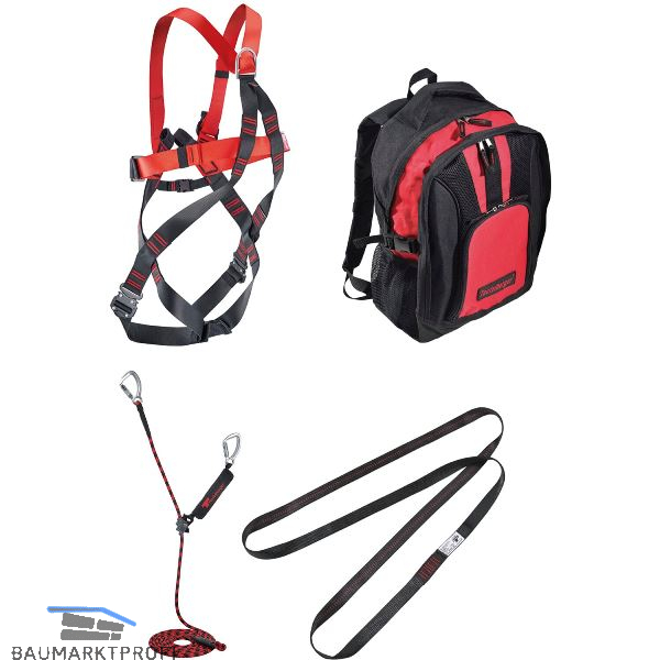 - Auffanggurt Ergo-Click, 1 Auffangöse am Rücken, 1 Auffangöse vorne im Brustbereich mit Ergo-Click Schnallen in den Beinschlaufen.