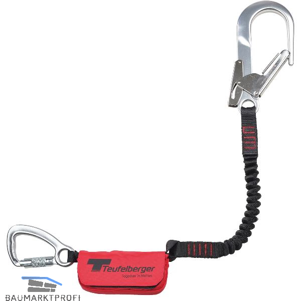 Der FallSorb i-bungy wird mit einem einsträngigen Verbindungsmittel aus Elastik-Band ausgeführt. Das Verbindungsmittel bungy besteht aus einem elastischen Textilband in Schwarz. Es zieht sich in der Verwendung in die Länge und bei Nichtverwendung verkürzt es sich wieder. Somit kann es für den Transport sehr kompakt am Gurt getragen werden.