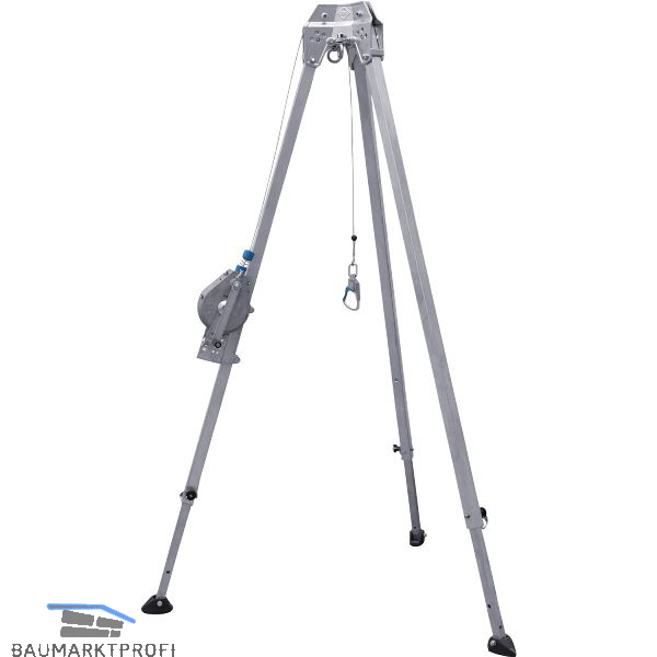 Ausführung: Zugelassen für 2 Personen, Kopf mit Rastbolzen fixierbar, 3 Winkelstellungen der Beine möglich, 3 Integrierte Edelstahl-Umlenkrollen (Ø4,8 – 11 mm) am Kopf des Dreibeins, 3 Anschlag- und Abspannösen seitlich am Kopf des Dreibeins, Gewicht 24 kg.