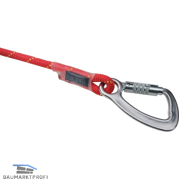Kernmantelseil weiß mit rotem Kennfaden, einerseits Schlaufe vernäht, anderseits Croc-Karabiner aus Stahl, D-Form mit Auge. Keylock-Verschluss und Trilock-Sicherung. Öffnungsweite 25 mm. Das Seil zeichnet sich durch sein geringes Gewicht und seine hohe Bruchfestigkeit aus. Außergewöhnlich geringe Dehnung, sehr gute UV-Stabilität, gute Beständigkeit gegen Säuren.