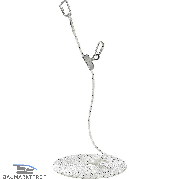 Ausführung: Auffanggerät aus Stahl verzinkt, Kernmantelseil mit geringer Dehnung TUTOR XG 12 mm, Stahl-Schraub-Karabiner am oberen Seilende fest eingenäht, Seilendknoten am unteren Seilende, Stahl-Schraub-Karabiner am Gerät fest eingebaut, Falldämpfung integriert.