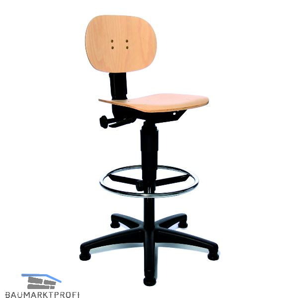 Sitz und Rückenlehne aus körpergerecht geformtem Buchenschichtholz, naturfarben lackiert. Rückenlehne in der Höhe und in der Neigung verstellbar, Permanentkontakt. Fünffuß-Untergestell. Höhenverstellung mittels Gasfeder.
