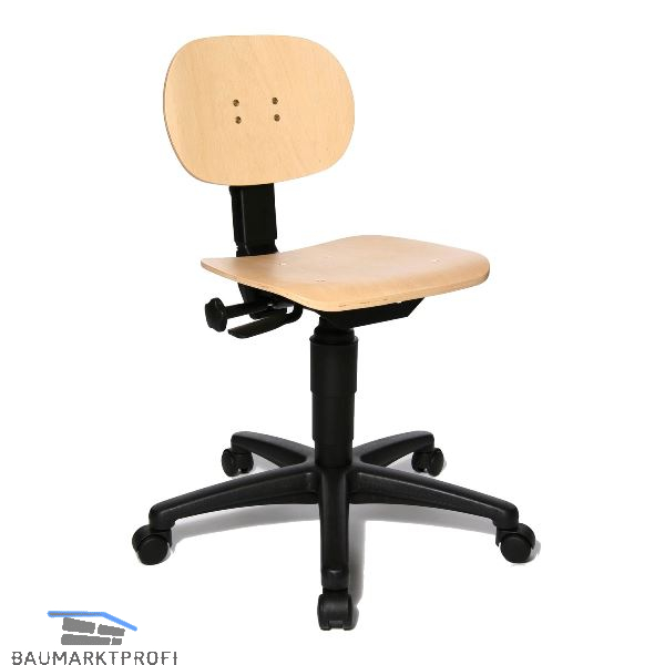 Sitz und Rückenlehne aus körpergerecht geformtem Buchenschichtholz, naturfarben lackiert. Rückenlehne in der Höhe und in der Neigung verstellbar, Permanentkontakt. Fünffuß-Untergestell. Höhenverstellung mittels Gasfeder.
