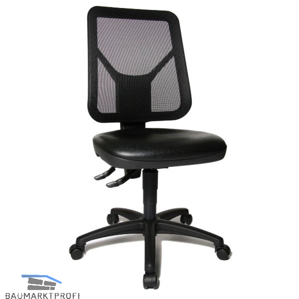 Sitz aus PU-Schaum, Rückenlehne in der Höhe und der Neigung verstellbar, Permanentkontakt-Mechanik, mit atmungsaktivem Netzbezug. Fünffuß-Untergestell. Höhenverstellung mittels Gasfeder.