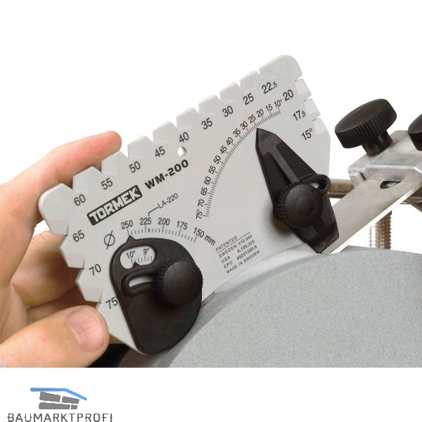 Zum Einstellen und Messen von Schneidenwinkeln zwischen 15-75°, für alle Steindurchmesser von 150-250 mm.