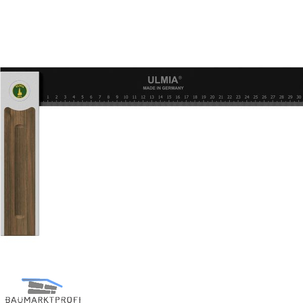 Kopfstück (Schenkel) aus Aluminium Präzisionsfrästeil, veredelt beidseitig durch Nußbaum-Holzeinlage mit Griffhohlkehlen. Stahlschiene gehärtet mit Maßskala und justierbar mittels Präzisionsjustierschraube. Diese Verbindung garantiert die hohe und dauerhafte Messgenauigkeit von ± 0,02 mm bei Winkeln 150, 250 und 350 mm, ± 0,04 mm bei Winkeln 600 mm.