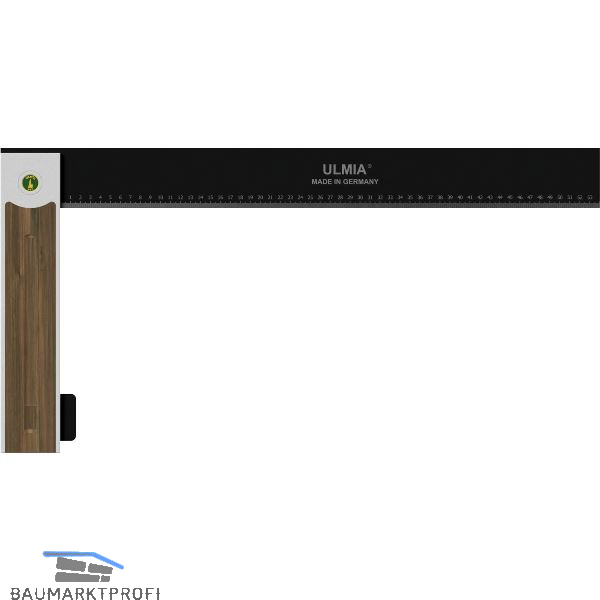 Kopfstück (Schenkel) aus Aluminium Präzisionsfrästeil, veredelt beidseitig durch Nußbaum-Holzeinlage mit Griffhohlkehlen. Stahlschiene gehärtet mit Maßskala und justierbar mittels Präzisionsjustierschraube. Diese Verbindung garantiert die hohe und dauerhafte Messgenauigkeit von ± 0,02 mm bei Winkeln 150, 250 und 350 mm, ± 0,04 mm bei Winkeln 600 mm.