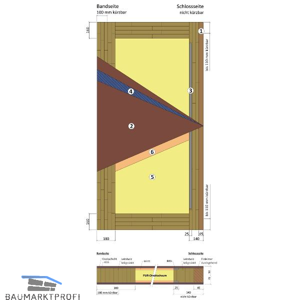 5. Kern-Dämmung PUR-Konstruktionskern, frei von HFCKW, baubiologisch geprüft, recyclingfähig, fugenfrei und kraftschlüssig- direkt verschäumt, dadurch wärmebrückenfrei.