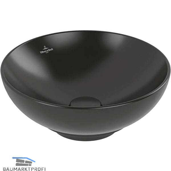Marke: Villeroy & Boch Type: 4A4500R7 Ausführung: rund Material: Keramik Farbe: Pure Black Oberfläche: CeramicPlus Einbauvariante: Aufsatz Unterbau ab (mm): 400 Außenmaß (mm): ø 380 x 120 Beckengröße (mm): ø 365 x 100 Grundausstattung: mit Überlauf, ohne Ventil, ohne Bohrloch, ohne Siphon, Unterseite geschliffen