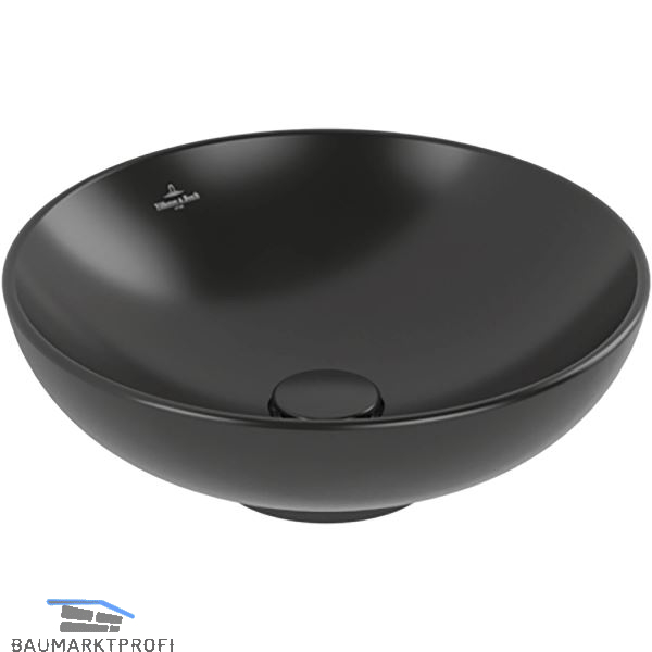 Marke: Villeroy & Boch Type: 4A4600R7 Ausführung: rund Material: Keramik Farbe: Pure Black Oberfläche: CeramicPlus Einbauvariante: Aufsatz Unterbau ab (mm): 450 Außenmaß (mm): ø 420 x 120 Beckengröße (mm): ø 405 x 100 Grundausstattung: mit Überlauf, ohne Ventil, ohne Bohrloch, ohne Siphon, Unterseite geschliffen
