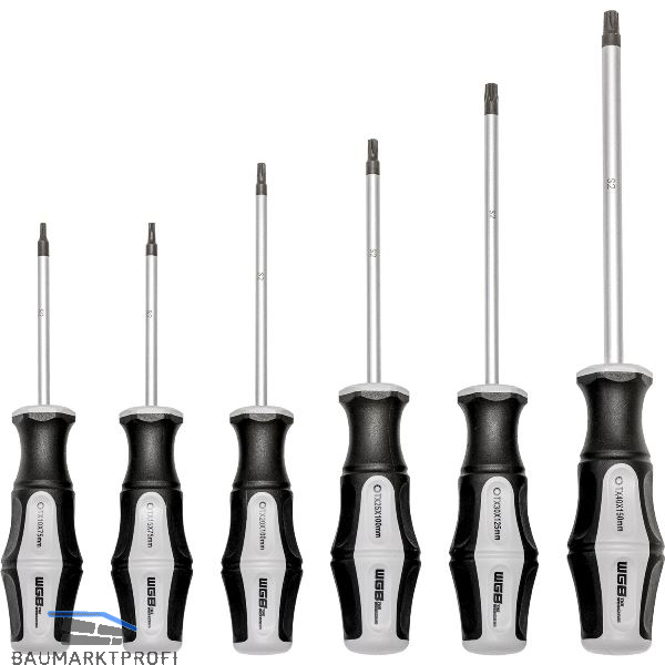 Inhalt: je 1 St. Torx mit Schlagplatte 10 x 75 / 15 x 75 / 20 x 100 / 25 x 100 / 30 x 125 / 40 x 150 mm.