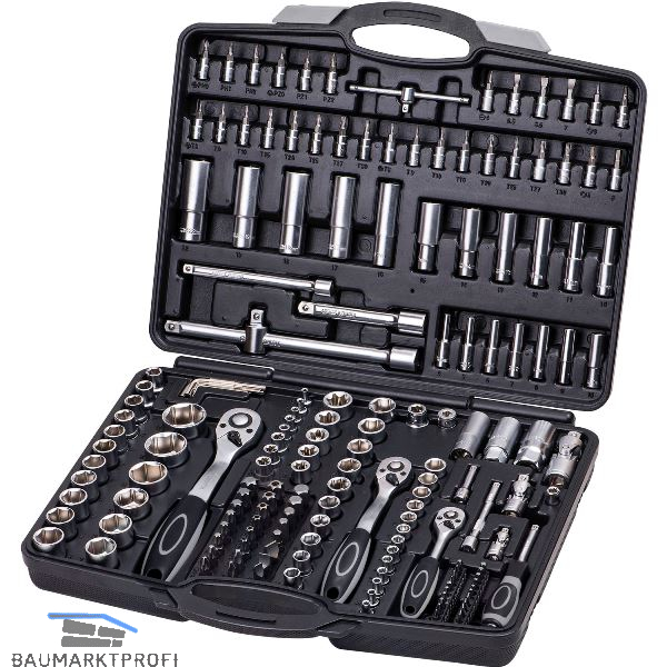 1/2" Antrieb: Einsätze-Sechskant: 10, 11, 12, 13, 14, 15, 16, 17, 18, 19, 20, 21, 22, 24, 27, 30, 32 mm, Einsätze-Sechskant-lang: 16, 17, 18, 19, 22 mm, E-TX-Einsätze : E20, E24, Zündkerzen-Einsatz: 16, 21 mm, Adapter-Gleitstück 3/8" x 1/2", Verlängerung: 125 mm + 250 mm, Hebelumschaltknarre , 72 Zähne, 250 mm, Adapter für 10 mm Bits, Kardangelenk
