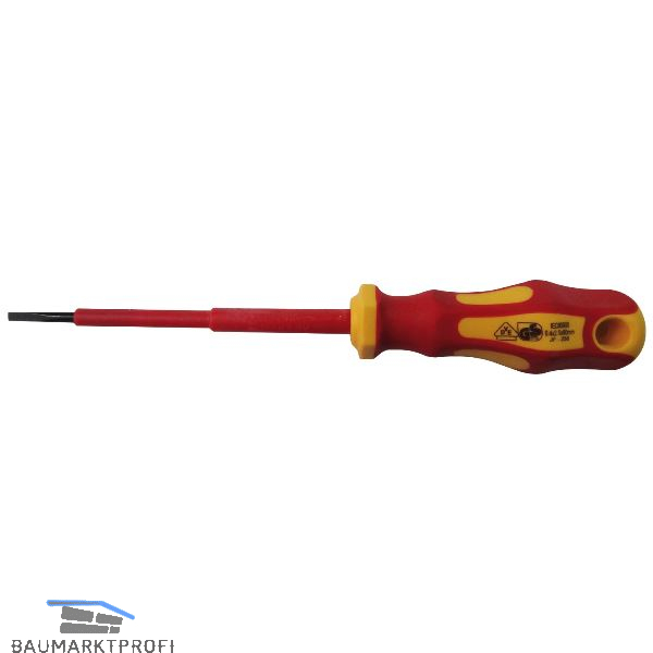VDE isoliert bis 1000 V, mit isolierter Klinge nach DIN EN 60900 VDE 0682 Teil 201. 2- Komponentenheft mit Aufhängeloch. Klinge aus Molybdän-Vanadium Stahl mit schwarzer Spitze.