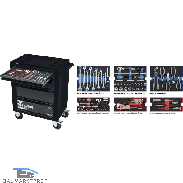 stabile Stahlblechkonstruktion mit widerstandsfähiger Pulverbeschichtung, zuverlässiger Kantenschutz an allen Fahrzeugseiten, NO-RISK-Auszugssperre gegen Kippen des Wagens, 2 Bock- und Lenkrollen aus Polypropylen, Handgriff zum leichten Rangieren, Seitenbleche mit Schlüssellochung zur Erweiterung mit Zusatzhalterungen, ABS-Kunststoffauflage mit Kleinteilefächern, inkl. 10 Schubladeneinteiler zur Organisation