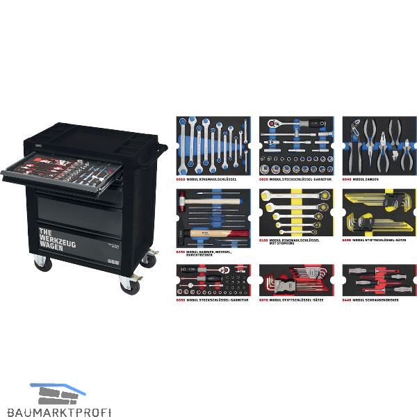 stabile Stahlblechkonstruktion mit widerstandsfähiger Pulverbeschichtung, zuverlässiger Kantenschutz an allen Fahrzeugseiten, NO-RISK-Auszugssperre gegen Kippen des Wagens, 2 Bock- und Lenkrollen aus Polypropylen, Handgriff zum leichten Rangieren, Seitenbleche mit Schlüssellochung zur Erweiterung mit Zusatzhalterungen, ABS-Kunststoffauflage mit Kleinteilefächern, inkl. 10 Schubladeneinteiler zur Organisation