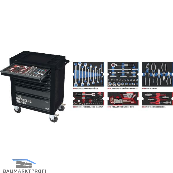stabile Stahlblechkonstruktion mit widerstandsfähiger Pulverbeschichtung, zuverlässiger Kantenschutz an allen Fahrzeugseiten, NO-RISK-Auszugssperre gegen Kippen des Wagens, 2 Bock- und Lenkrollen aus Polypropylen, Handgriff zum leichten Rangieren, Seitenbleche mit Schlüssellochung zur Erweiterung mit Zusatzhalterungen, ABS-Kunststoffauflage mit Kleinteilefächern, inkl. 10 Schubladeneinteiler zur Organisation