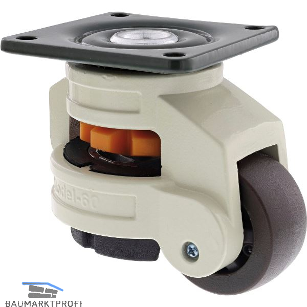 Diese Spezialrolle kombiniert zwei Funktionen in einem: Sie dient als Schwerlast-Lenkrolle und die leicht bedienbare Nivellierfunktion verwandelt mit wenigen Drehbewegungen mobile Geräte durch den integrierten Standfuß schnell in standfeste Arbeitsstationen. Das Gehäuse besteht aus robustem Aluminium-Druckguss, die Anschraubplatte aus massivem Industriestahl. Die Radlauffläche aus abriebfestem Kunststoff (PA) sorgt für hohe Belastbarkeit, während der rutschhemmende Standfuß aus weichem TPR sicheren Halt bietet. Die kompakte Bauweise und die hochwertige Verarbeitung garantieren Langlebigkeit, besten Fahrkomfort und zuverlässige Stabilität – selbst bei Dauerbelastung.