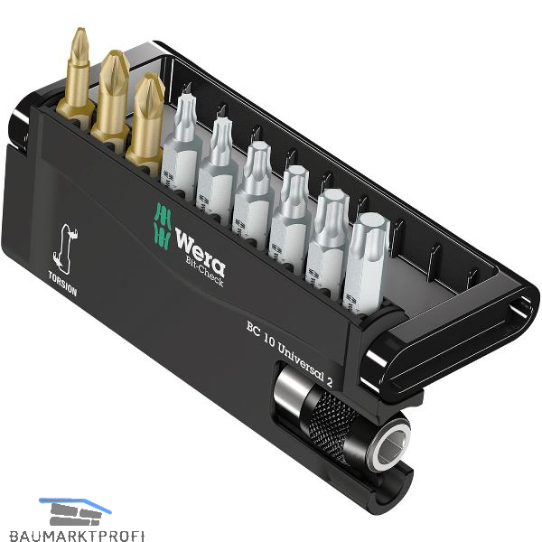 Robuster Bit-Check von Wera. Bit-Checks ermöglichen einen schnellen Überblick über das vorhandene Werkzeug. Inklusive Universalhalter mit starkem Dauermagnet und Schnellwechselfutter für die Aufnahme von Bits mit 1/4"-Außensechskantantrieb nach DIN ISO 1173-C 6,3. Zur Aufnahme in die Schraubermaschine oder zum Einsatz in das Futter der elektronischen Bohrmaschine. Inklusive Torsionsbits gegen frühzeitigen Verschleiß. Extrahart.