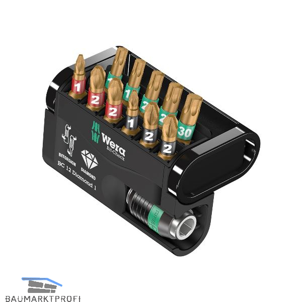 Bithalter Rapidaptor mit Schnellwechselfutter, BiTorsions Bits für lange Lebensdauer, in diamantbeschichteter Ausführung. BDC für sicheren Sitz in der Schraube. Mit Farbkennung "Take it easy".