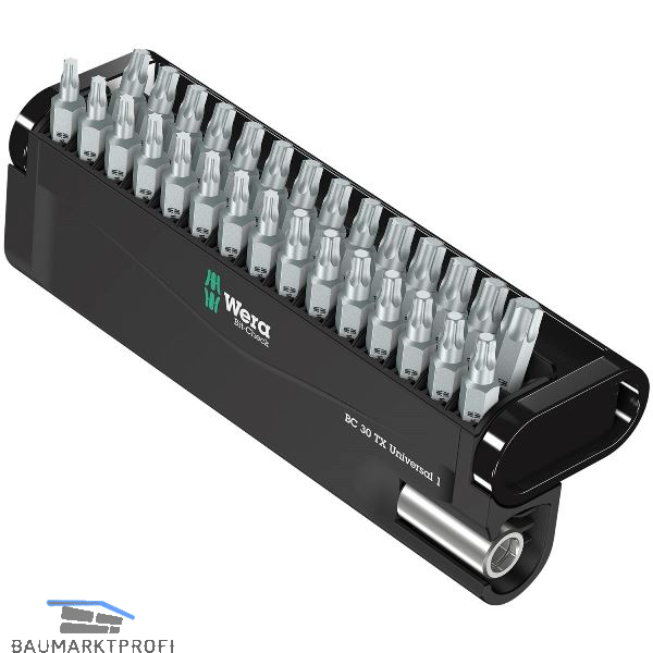 Universalhalter mit Edelstahlhülse, Sprengring und starkem Dauermagnet, zähharte Bits für den universellen Einsatz.