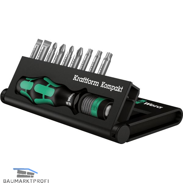 9 zähharte Bits, für den universellen Einsatz. Torsionsform gegen frühzeitigen Verschleiß. 1 Handhalter 813 R Kraftform mit Schnellwechselfutter Rapidaptor, mehrkomponentig für hohe Arbeitsgeschwindigkeiten und besonders ergonomisches Verschrauben.