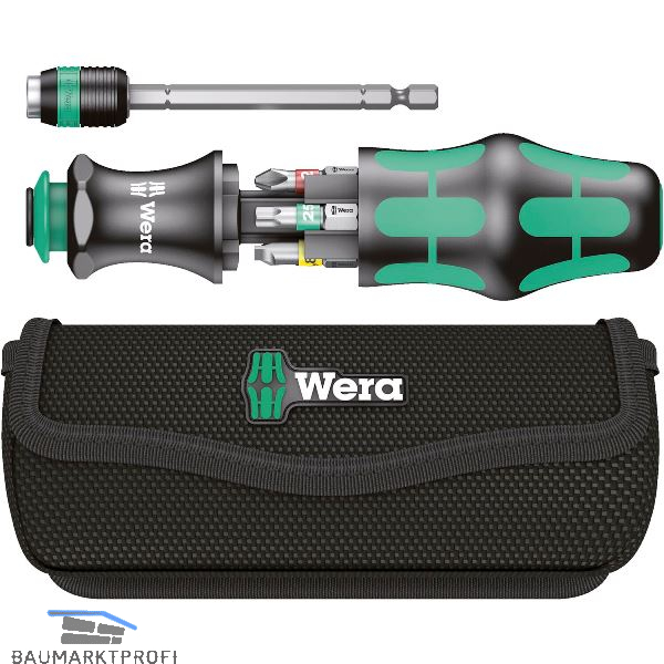 Kraftform Kompakt. Kompaktes Werkzeug für Hand- und Maschinenbetrieb. Geeignet für Bits mit 1/4"-Außensechskantantrieb nach DIN ISO 1173-C 6,3 und E 6,3 (ISO 1173). Kraftform-Griff mit Abrollschutz, mehrkomponentig für besonders ergonomisches Verschrauben. Integriertes Magazin zur Aufbewahrung für Bits. Wera Werkzeugfinder "Take it easy" mit Farbcodierung und gut sichtbarer Beschriftung.