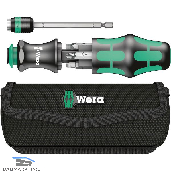 Gleichzeitiger Einsatz der beiden Verschraubungsarten "Hand" oder "Maschine". Griff -Wechselklingensystem in kompakter Bauweise mit verschiedenen Klingenspitzen. Geeignet für Bits mit 1/4"-Außensechskantantrieb nach DIN ISO 1173-C 6,3 und E 6,3 (ISO 1173) und Wera Anschluss-Reihen 1 und 4. Integriertes Magazin zur Aufbewahrung der Bits. Bajonett-Klinge kann für beengte Schraubsituationen eingefahren bzw. entnommen werden. In robuster Tasche.