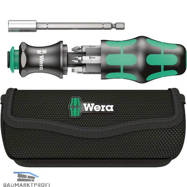 Wera Kompaktwerkzeug mit mehrkomponentigem Kraftform Griff. Integriertes Bit-Magazin im Griff, in dem 6 Bits aufbewahrt werden können. Bajonett-Klinge kann für beengte Schraubsituationen eingefahren bzw. entnommen werden. Der Sprengring und der starke Dauermagnet garantieren festen Sitz der Bits. In robuster Tasche.