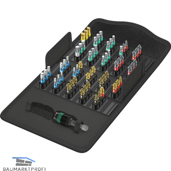 Bithalter Rapidaptor mit Schnellwechselfutter. 49 BiTorsion Bits in diamantbeschichteter Ausführung für sicheren Sitz in der Schraube. 11 Bits in zähharter Ausführung.